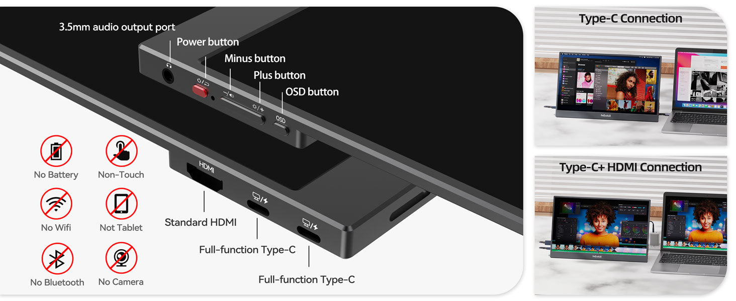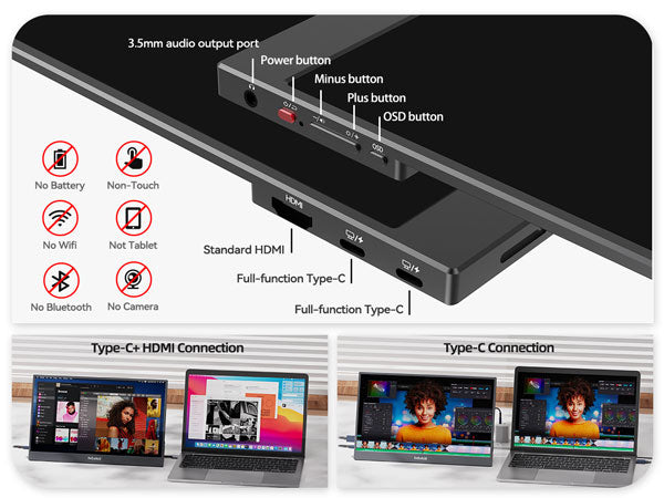 MULTI-DEVICE COMPATIBILITY FOR WORK & PLAY: Featuring one HDMI standard port and two full-featured USB-C ports, this fhd 1080p portable monitor easily connects to laptops, PCs, phones and gaming consoles. Switch between devices for work, gaming or presentations with ease, making it versatile external screen for laptop anytime, anywhere